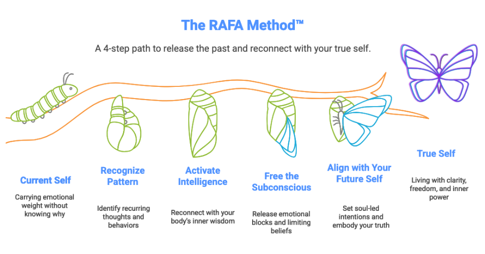 The RAFA Method™ guides you through a gentle yet powerful transformation journey: from inherited pain and emotional overwhelm… to clarity, freedom, and deep alignment with your true self.