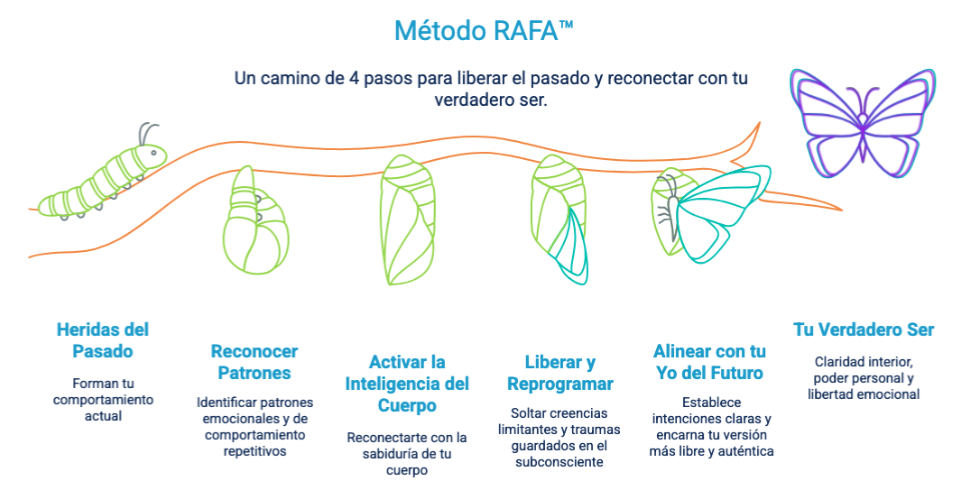 El Método RAFA™ fue creado para revelar y liberar con suavidad estos bloqueos desde la raíz — para que por fin puedas sentirte más liger@, libre y auténtic@ nuevamente.